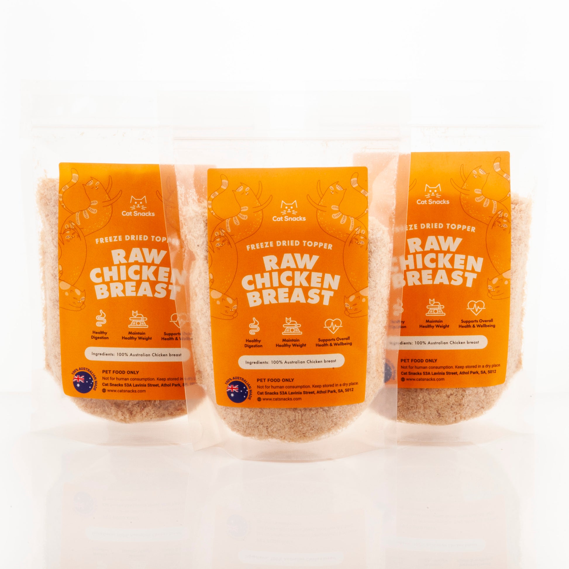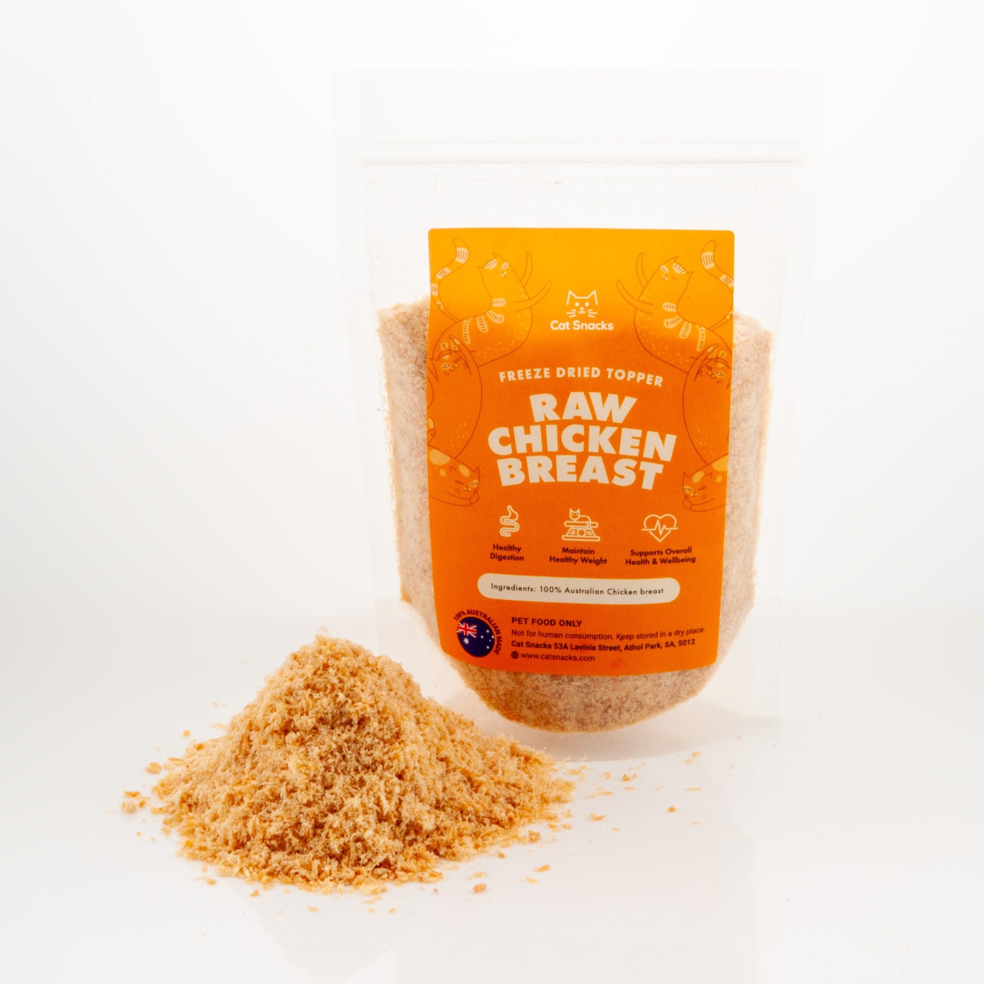 Cat Snacks raw Chicken Breast meal topper is made from 100% Australian Chicken Breast that has been freeze dried, and blended into a fine powder. Ideal if you have a fussy cat at home or are just looking to boost your cat's diet.