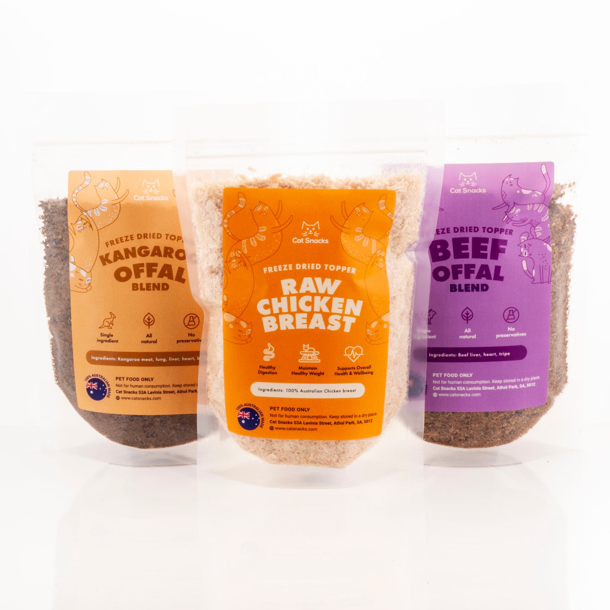 Give your cat a variety of proteins with our new freeze-dried Triple protein pack. Rotating your cats protein is a fantastic way to give them a variety of nutrients. Raw toppers offer a balance of nutrients as well as beneficial bacteria and enzymes. Each pack is nutritionally balanced, very healthy, and easy for cats to digest - the perfect treat for sensitive stomachs.